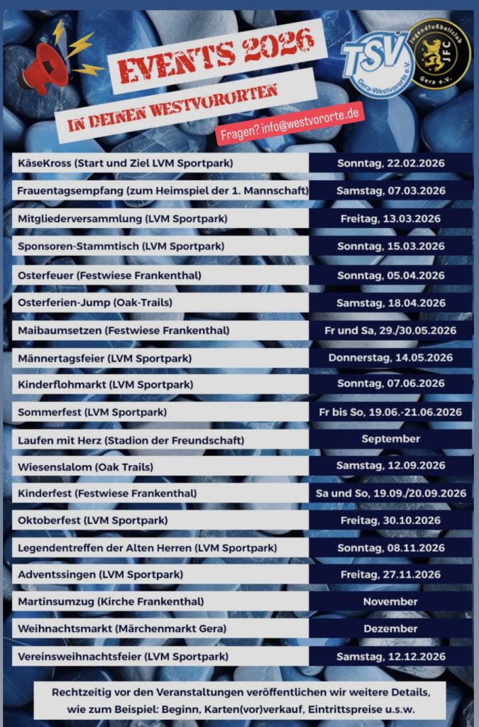 Newsletter 01/2026 Der Vorstand des TSV Gera-Westvororte wünscht all seinen Vereinsmitgliedern und deren Familien und Freunden, allen Unterstützern und Sponsoren, den treuen Fans und allen Freunden des Vereins nochmals alles ....
