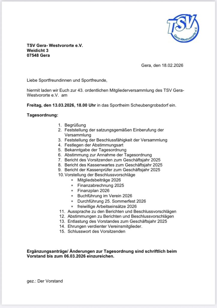 Liebe Vereinsmitglieder, hiermit laden wir Euch recht herzlich zur 43. Ordentlichen Mitgliederversammlung des TSV Gera-Westvororte e.V. ein. Termin: Freitag, 13.03.2026 um 18:00 Uhr Veranstaltungsort ist das Vereinsheim des ..