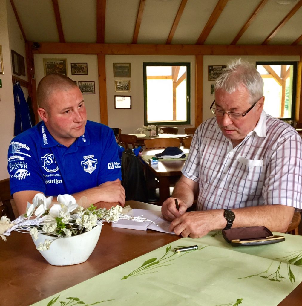 Foto: Letzte „taktische“ Absprachen zwischen Sebastian Peter als Vertreter der FFW Feuerwehr Gera Frankenthal und dem Vorsitzenden des TSV Gera-Westvororte, Dr. Michael Pannach, gestern Abend im Vereinsheim der Saarbach-Arena.