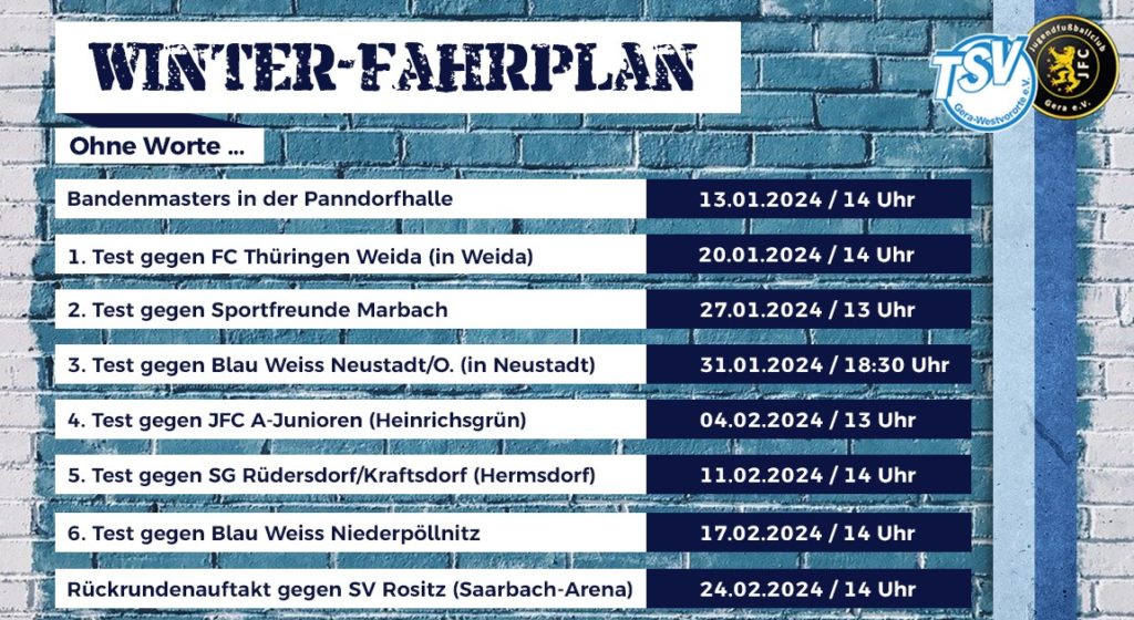 (09.01.2024) Endlich können wir ihn veröffentlichen – unseren Winterfahrplan 2024 … gespickt mit hochinteressanten Gegnern, der Teilnahme am mittlerweile traditionellen Bandenmasters und gefüllt mit intensiven, aber auch sehr abwechslungsreichen Trainingseinheiten.