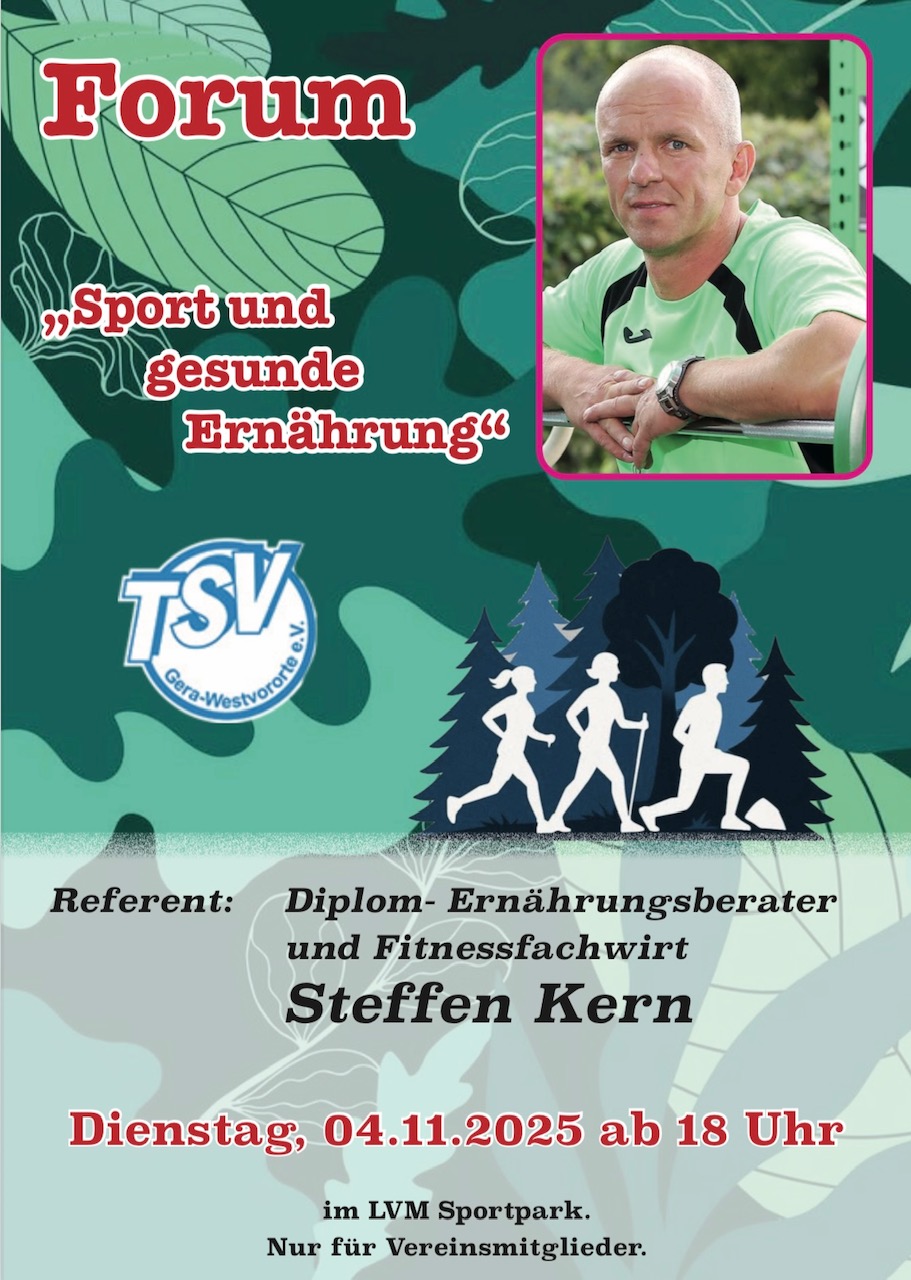 (14.10.2025) Hiermit laden wir alle Vereinsmitglieder des TSV Gera-Westvororte recht herzlich zum Experten-Forum „Sport und Ernährung“ ins Vereinsheim des LVM Sportpark Saarbachtal ein. Am Dienstag, d. 04.11.2025 um 18:00 Uhr erfahren wir in gut 1 ½ Stunden alles über Sport UND gesunde Ernährung.