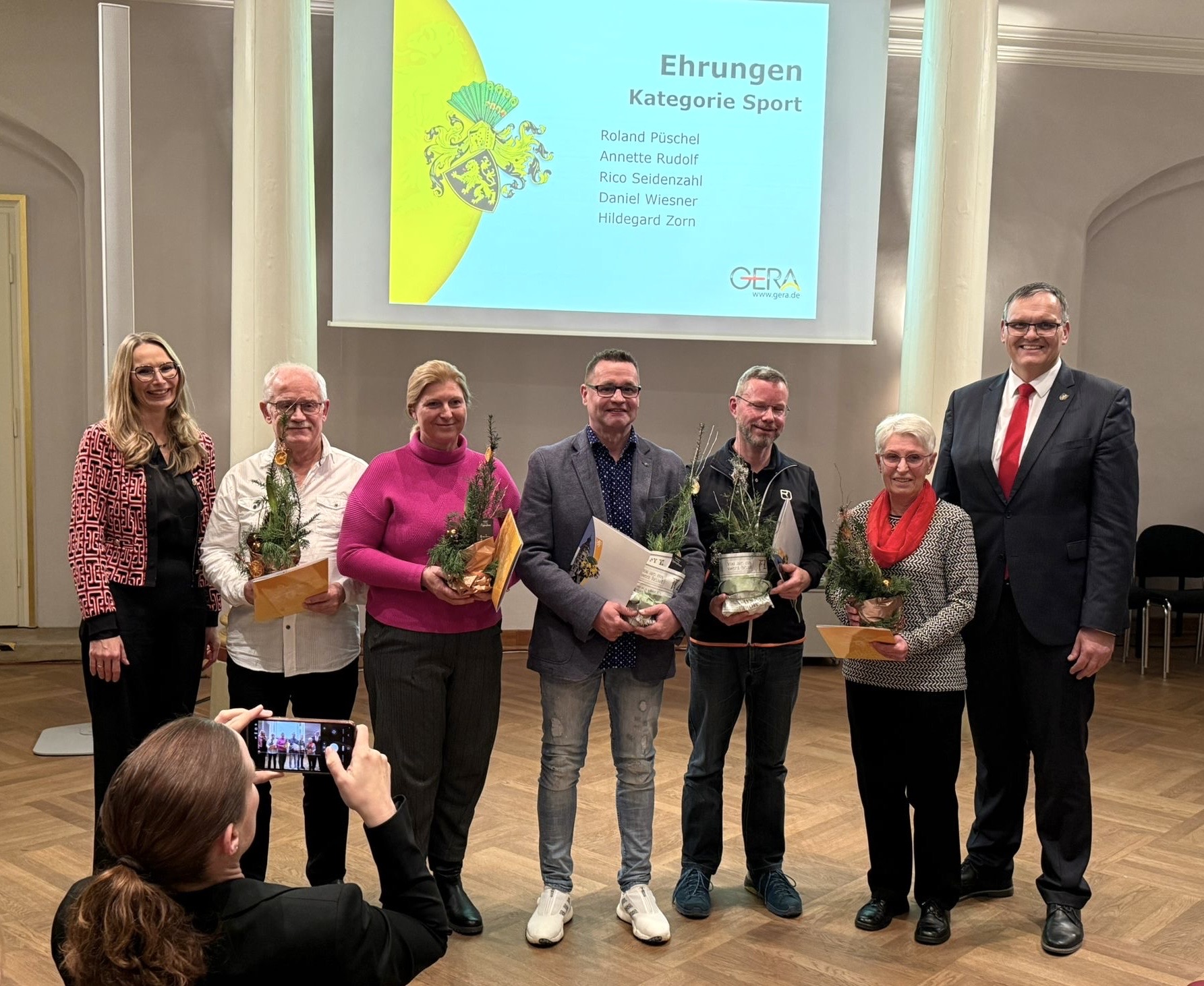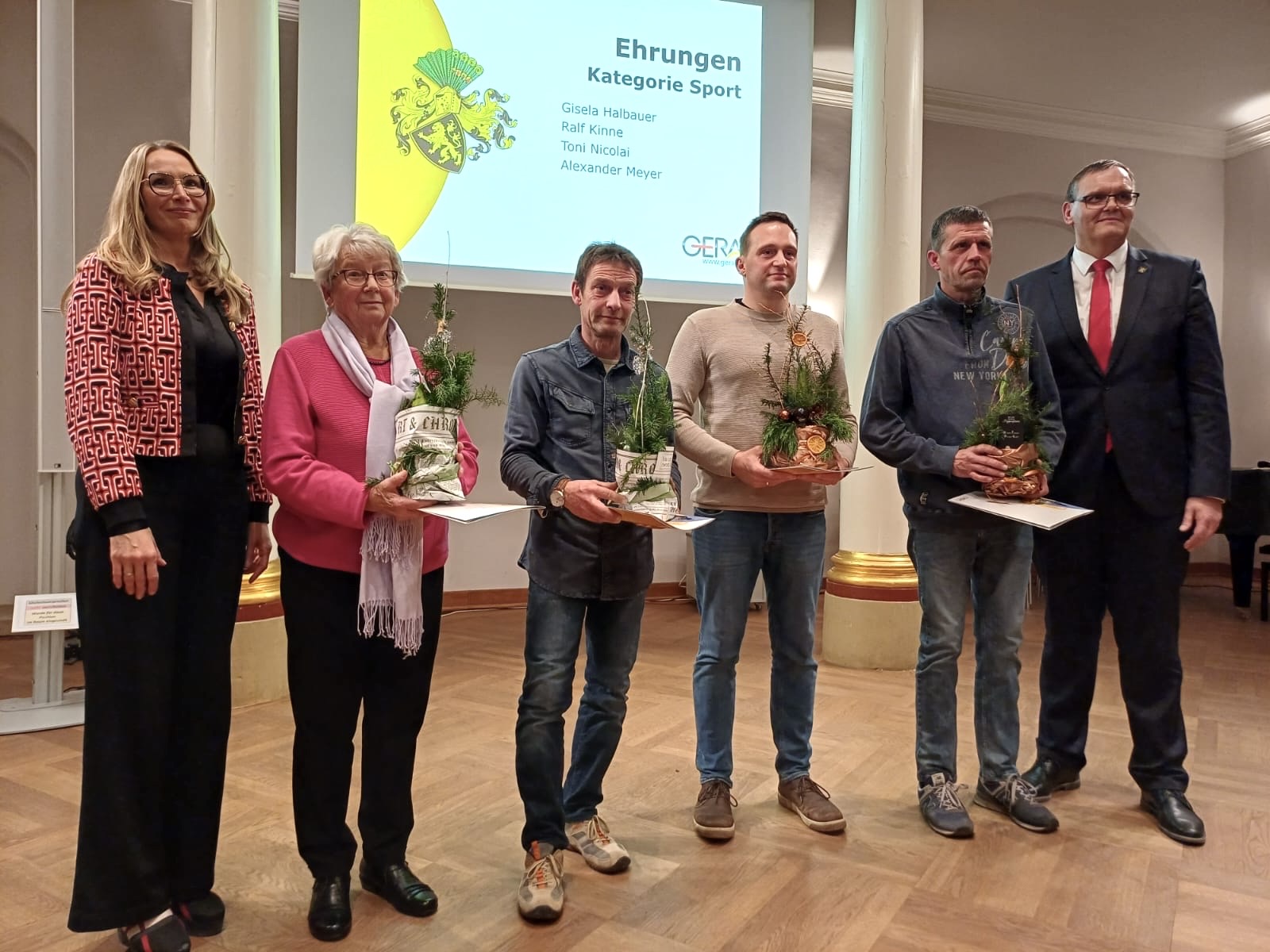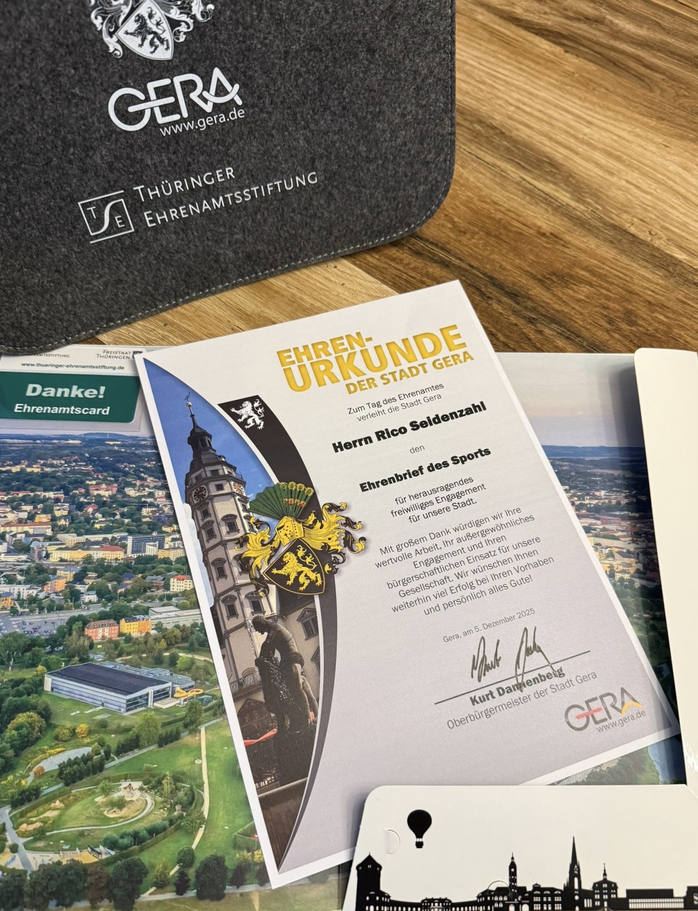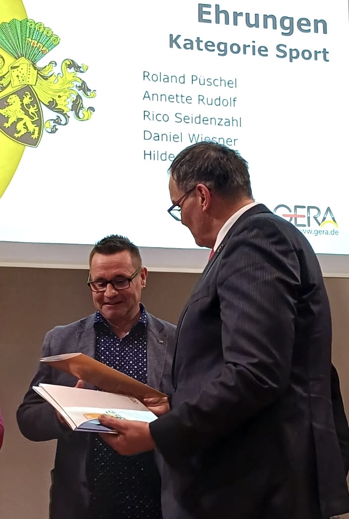 Ralf Kinne und Rico Seidenzahl nahmen, von Ihren Ehefrauen begleitet, in feierlicher Atmosphäre im Rathaussaal den „Ehrenbrief des Sports der Stadt Gera“ aus den Händen unseres Oberbürgermeisters Kurt Dannenberg entgegennehmen.