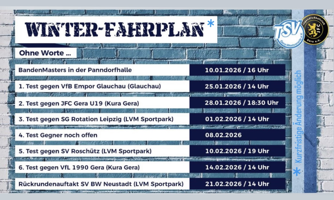 Ernst wird es dann erstmal am Sonntag, d. 25.01.2026, wenn unser TSV ab 14:00 Uhr beim von Nico Quade trainierten Oberligisten VfB Empor Glauchau zu Gast ist. Weitere fünf Tests stehen auf der Agenda, ehe am 21.02.2026 mit dem Heimspiel gegen Neustadt die Rückrunde der Verbandsliga offiziell startet.