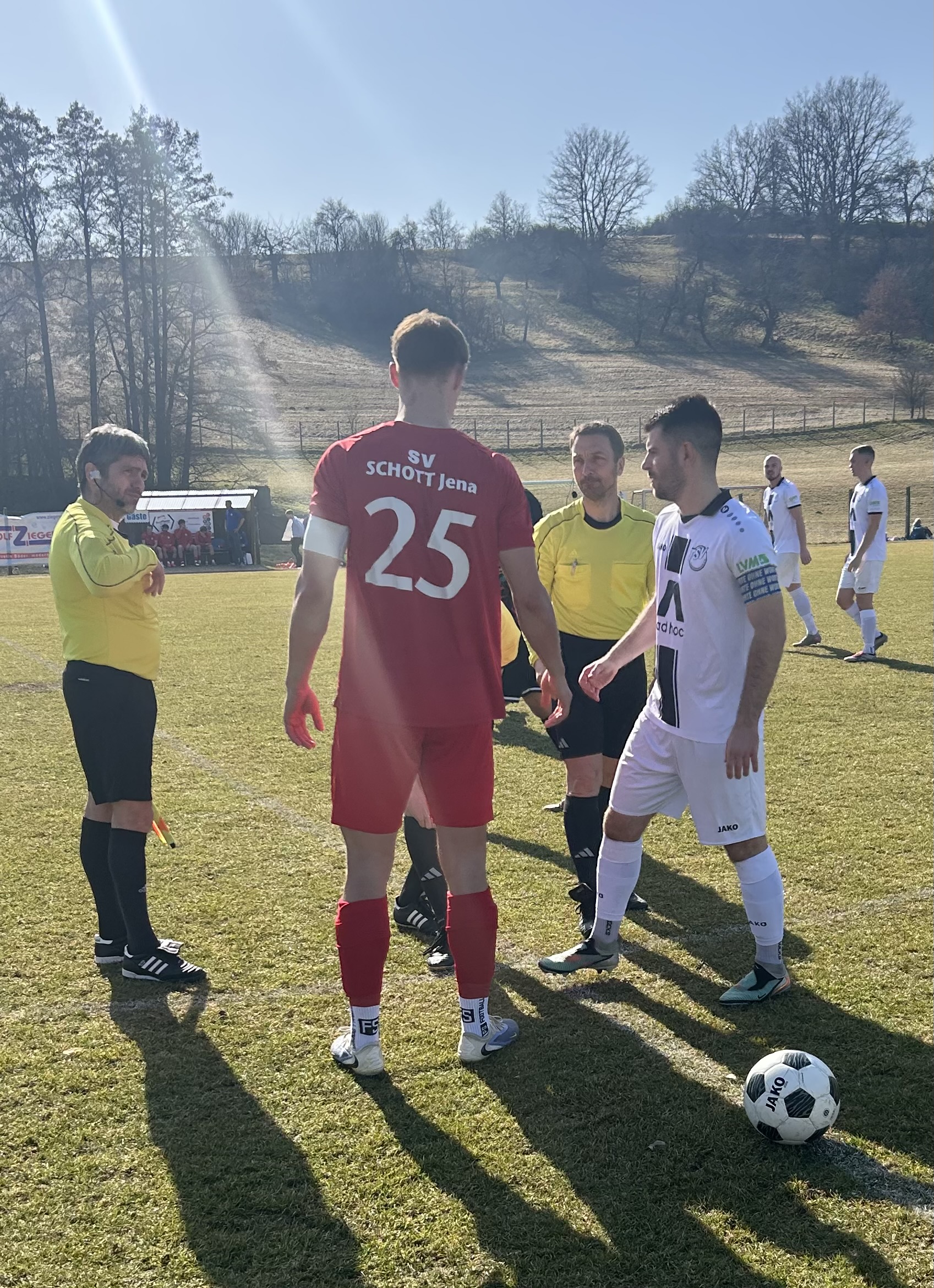 Mit einer kurzen Trauerrede unseres Vorsitzenden Heiko Linke und einer anschließenden Schweigeminute für Silke Schöler-Winefeld, Mutti unseres Spielers Sascha Winefeld, die vor kurzem nach langer, schwerer Krankheit viel zu jung verstorben ist, begann der Nachmittag nachdenklich und demütig. Danke an dieser Stelle an der Schiedsrichter-Team und die Mannschaft vom SV Schott Jena, dass man uns kurz vor Spielbeginn die Möglichkeit gegeben hat, Silke in diesem Rahmen zu ehren und ihr zu gedenken.