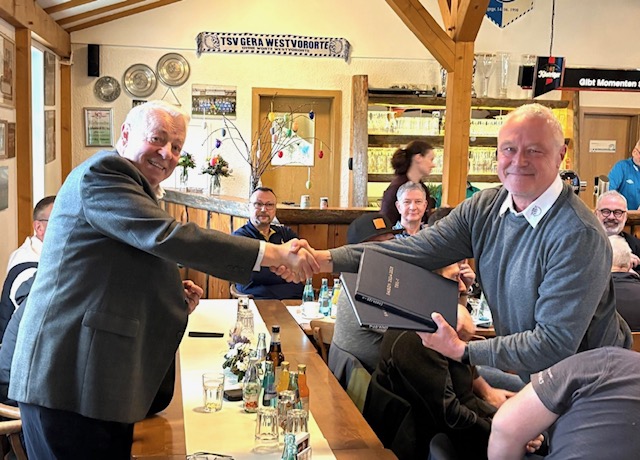 Lass but not least überreichte unser Ehrenvorsitzender Dr. Michael Pannach dem Vorstand die eigens von ihm für den Verein angefertigte Chronik über die Saison 2024/25, die nunmehr die mittlerweile über 30 Bände umfassende Sammlung vervollständigt.