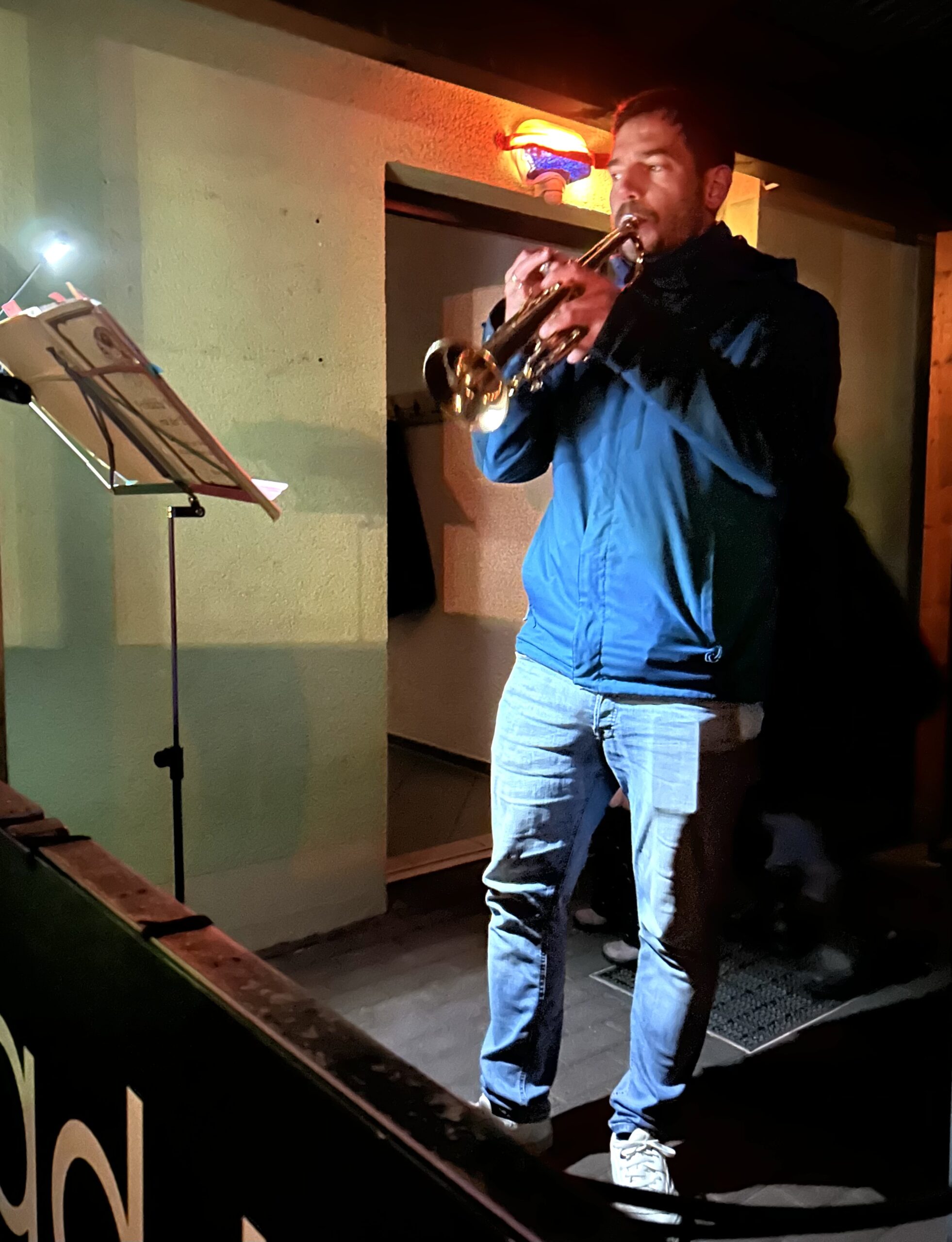 Aus dem Dunkel heraus ließ zum Ende der Veranstaltung und zur Überraschung aller Trompeter Martin aus den Westvororten als Höhepunkt des Adventssingens alle Beteiligten bei seinem Ständchen aufhorchen.