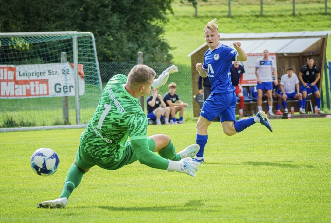 (02.11.2025) Mit Offensivdrang, viel Moral, dem Glück (des Tüchtigen) und einem bärenstarken Clemens Burgold im Kasten holen unsere Jungs einen nicht unverdienten Auswärtssieg in Weida. Bereits nach einer Minute das erste Lebenszeichen der Saarbach-Elf. Winefeld fasst sich aus 18 Metern ein Herz. Sein Abschluss zu zentral, aber ein erstes kleines Signal: wir stellen uns nicht hinten rein.