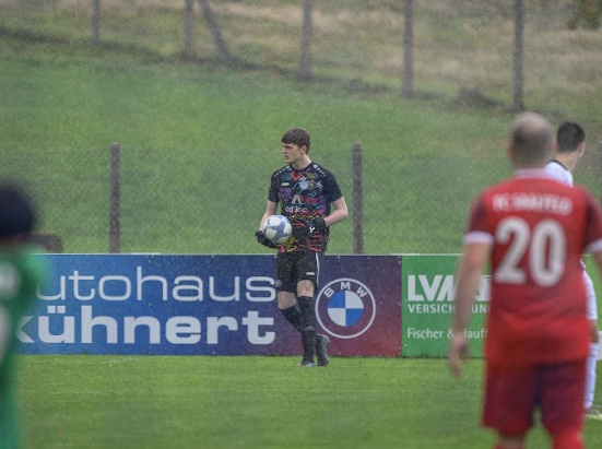 Aber wir machen das gut. Wir stellen uns nicht hinten rein. Wir wollen mitspielen. Und wir spielen mit. Gut sogar. Dann muss sich Cedric Thrum richtig lang machen. Per Glanzparade hechtet er den satten Aufsetzer, der auf dem mittlerweile leicht regennassen Geläuf richtig gefährlich wird, aus dem Eck. Stark, Ceric! Und nur eine Minute später steht unsere Nummer #1 nach einer gegnerischen Ecke abermals im Brennpunkt, löst aber auch diese gefährliche Situation resolut und routiniert.