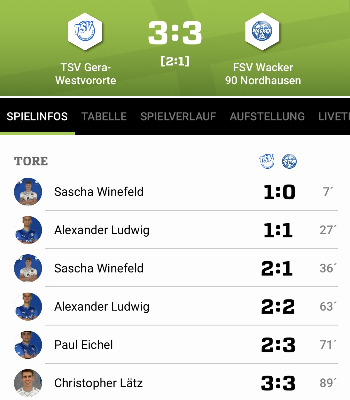 Stefan Kirchner kann mit dem Ball unbedrängt über den halben Platz laufen. Dann ein genialer Pass durch die Schnittstelle der Geraer Kette. Maxim Bevz läuft geschickt ein, steht am Strafraum blank und schiebt das Leder unhaltbar ins lange Eck. Der bittere Ausgleich. Pause.